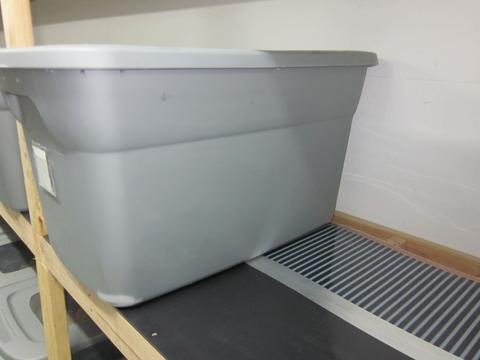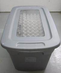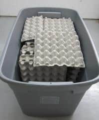 The other commonly used housing is plastic totes/tubs. These can range in size from 5-60 gallons. It is best to choose a dark opaque color rather than the clear style. When using these plastic totes all that is needed is for the center of the lid to be cut out and screen attached. This can be done by hot gluing window screen into the cut out area. I prefer to cut out most of the lid area, probably around 50-75% open. You can use aluminum or fiberglass window screen. Egg crates can then be stacked inside of the enclosure to give more surface area for the roaches to climb on.
